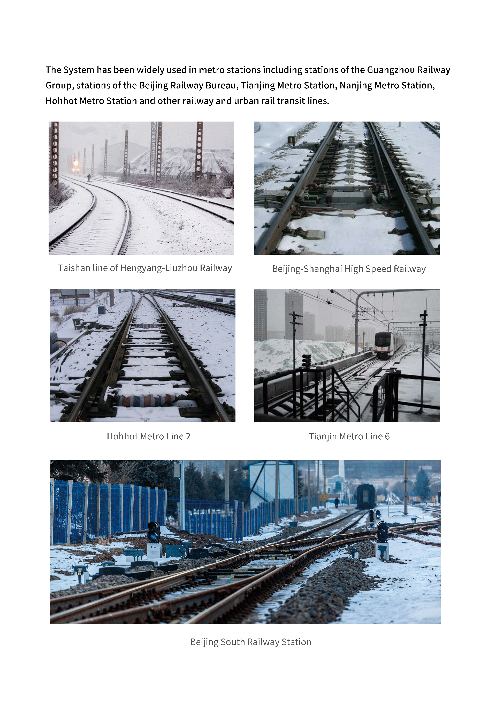 The System has been widely used in metro stations including stations of the Guangzhou Railway Group, stations of the Beijing Railway Bureau, Tianjing Metro Station, Nanjing Metro Station, Hohhot Metro Station and other railway and urban rail transit lines.