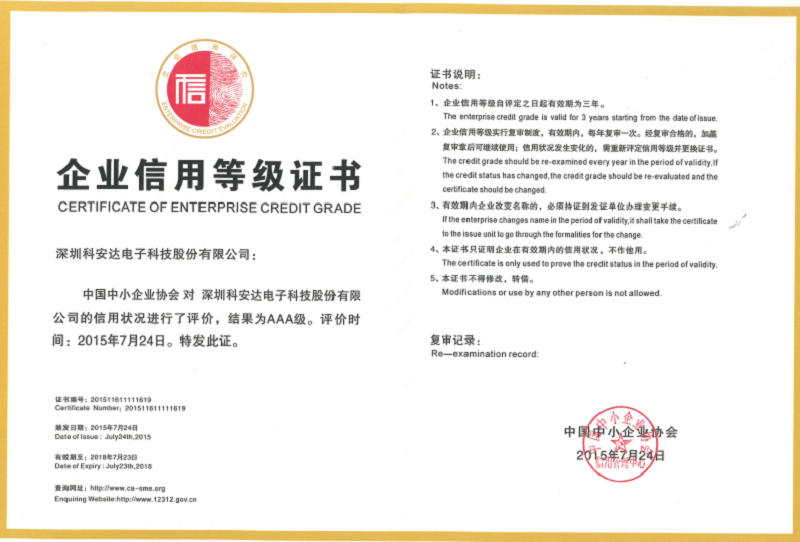 近期,深圳科安達電子科技股份有限公司獲得中國中小企業(yè)協(xié)會信用管理中心頒發(fā)的“企業(yè)信用評價AAA級信用企業(yè)”的牌匾和《企業(yè)信用等級證書》。信用編碼:CE07550007798;證書編號:201511611111619;《企業(yè)信用等級證書》由商務部和國務院國資委統(tǒng)一編號,有效期為3年。